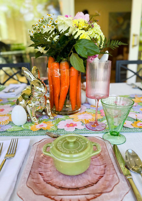 Springtime sweetness was in full bloom at this Easter gathering. Carrot-lined floral arrangements, pastel glassware, and artisan chocolate bunnies created a table that was equal parts elegant and festive.